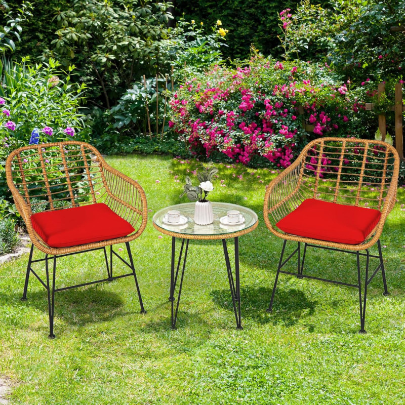 This set is the pint-sized perfection, and we can’t get enough of it. With a powder-coated stainless steel frame, the base of this set is rustproof and corrosion-resistant. Each piece is then wrapped in lovely rattan wicker, adding a gorgeous rustic touch to an otherwise-industrial design. Included with the set are two ergonomic armchairs and a small bistro table. Each chair has a fun, bright red seat cushion that makes for an incredibly comfortable feel.