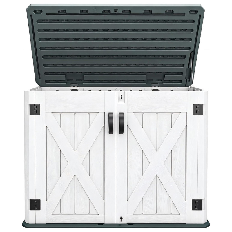 The entire bin has a wood slat design that belies the durable waterproof resin construction. Each door includes a large resin handle making them a breeze to open or close for easy access to everything inside. As an added benefit, the watertight seal on the lid keeps rainwater and melting snow out while the dual resin wall construction protects from unwanted impacts due to wind or other accidents.