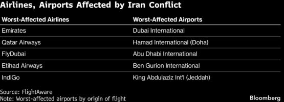 Emirates, the world’s largest international airline, halted regular operations to and from Dubai until 3 pm local time on Tuesday and warned of disruptions through Thursday. Etihad Airways said it extended cancellations until 3 pm Tuesday, while Qatar Airways said flights to and from Doha were suspended due to the closure of Qatari airspace.