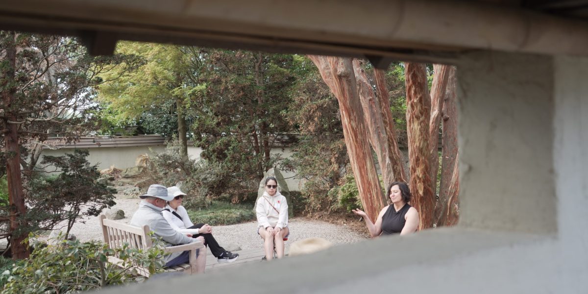 “I invite you to really spend the next 10 minutes just exploring this area,” she said, her own eyes closed. “Really focusing on your breath, on your footsteps. All the natural sounds around you. Maybe the manmade sounds, too. Thinking about the forest’s natural rhythm and how are part of that here in this urban, forested environment.”