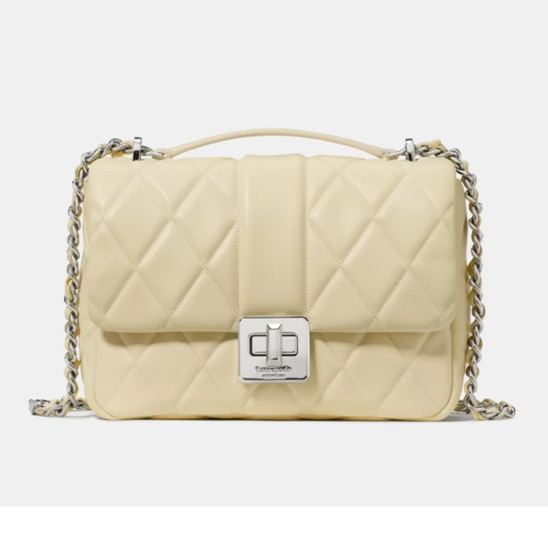 With an adjustable strap that features an 11.5-inch drop chain and a connector that prevents the chain from digging into your shoulder, this bag is comfortable to wear all day. The adjustability allows it to be worn over the shoulder with a double chain, or as a crossbody with a single chain. The smooth quilted leather texture on this bag looks precious and gives off the look of a frosted cake, which fits perfectly with the Lemon Fondant color name, offering a beautiful pastel yellow that’s perfect for spring. This bag is also available in Orange Jasper and Blue Multicolor.