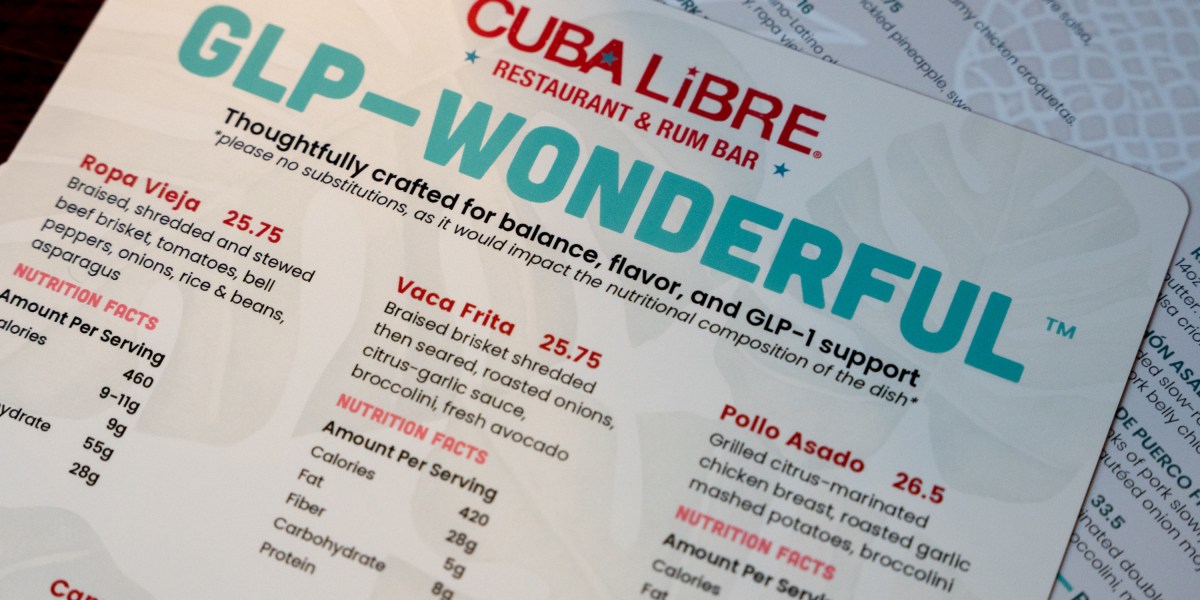 The menu has five classic Cuban options. Roque said the pollo asado on Cuba Libre’s regular menu has nearly 1,000 calories; on the GLP-1 menu, that’s slimmed down to 400 calories, but heavy on protein and fiber. He said it was also important to keep the GLP-1 meals flavorful and colorful, to stimulate appetites.