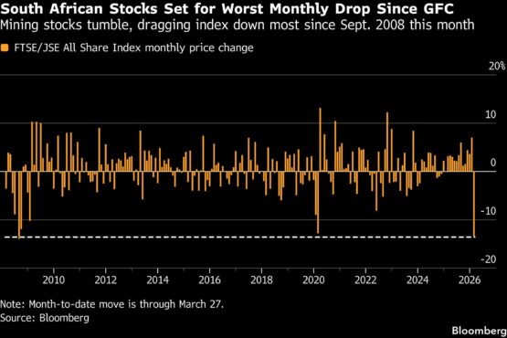 Johannesburg’s benchmark stock index is heading for its worst month in almost two decades, reeling from a double hit as the Iran war saps demand for emerging-market assets while plunging precious-metal prices weigh on the country’s miners.