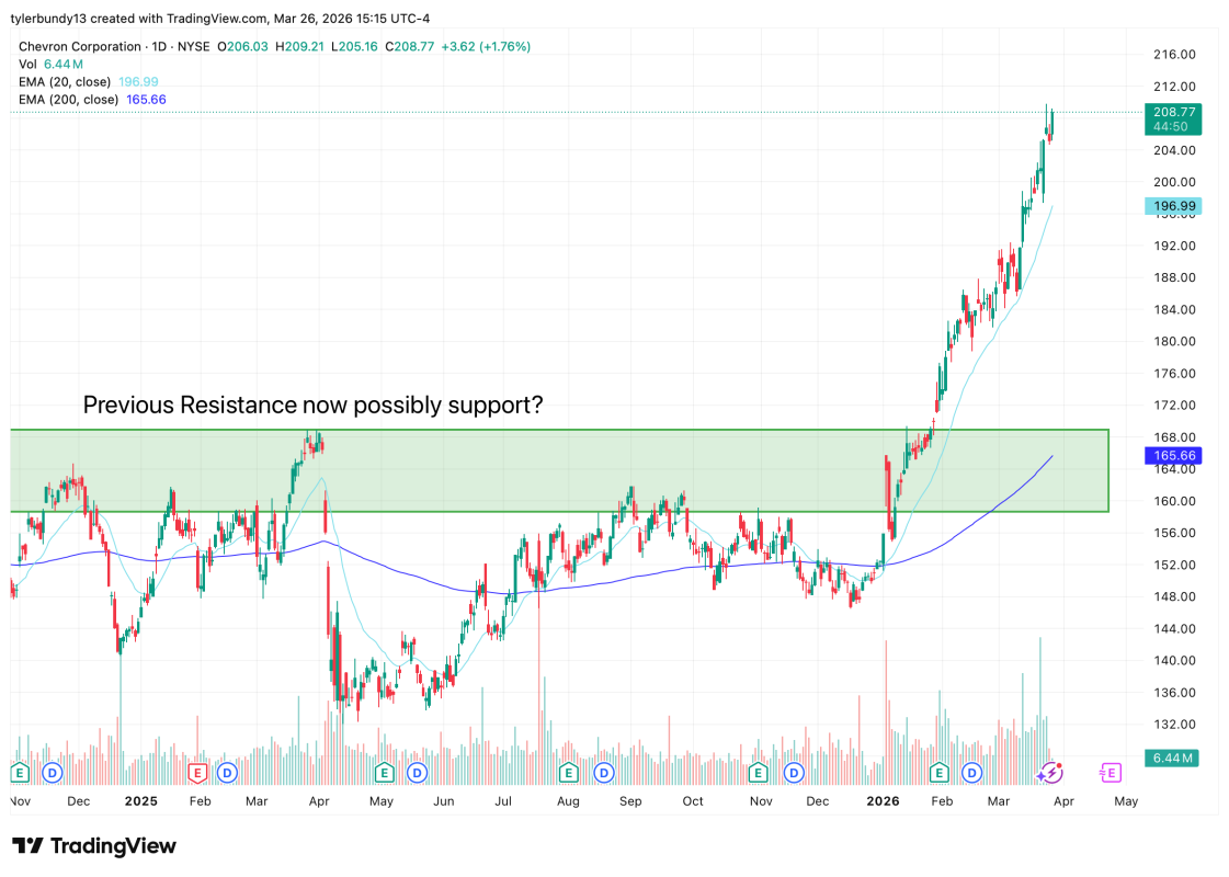 Chevron spent months fighting through that range, and once it cleared it, the move accelerated. If this oil rally cools off, that old ceiling is the first place traders will likely look for buyers to step back in.