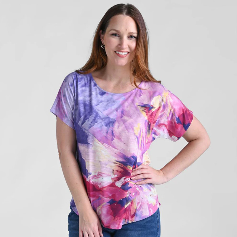 This top blends the popular cut with a scoop neck, leaving enough room to show off a dainty necklace or statement earrings. The print looks like it was painted with a wide watercolor brush and blends beautiful pastel and jewel-tone colors. It also adds an extra touch of sparkle, thanks to rhinestone details on the bottom left portion of the tee.