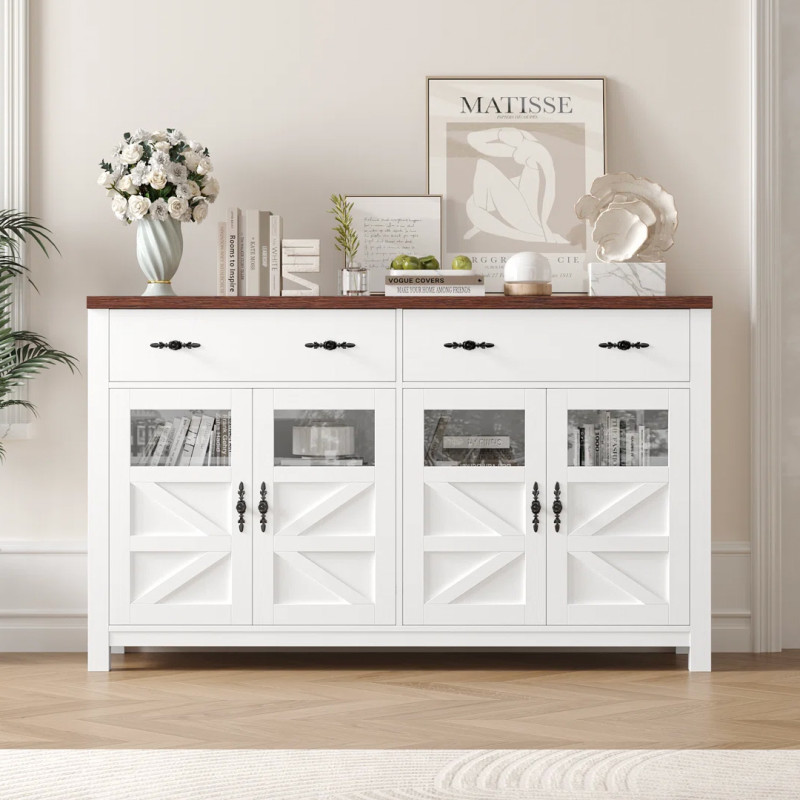 Not only is this accent cabinet gorgeous by design, but it’s built as the perfect storage space. Measuring 55.1 inches long, 15.4 inches wide, and 5.4 inches high, it has ample space to store household items, dishware, seasonal decor — frankly, anything you so desire. Made of sturdy manufactured wood, the accent cabinet has two shelving areas, broken up into four storage spaces that are tucked away behind four glass and wood cabinet doors. Each shelving “cubby” measures 25.5 inches long, 13.4 inches wide, and 10.83 inches high, and is adjustable so you can accommodate it to fix overly large or small items and keep them secure. Because you can see what you’re storing on those shelves through the upper glass portion of the cabinet doors, it also provides the opportunity to personalize the space in a decorative way to look appealing to the eye. The bottoms of the cabinets feature an X-shaped detailing that gives it that antique farmhouse look.