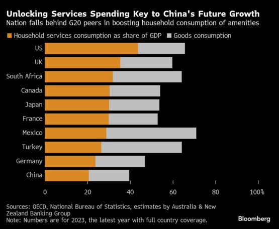 While officials seem more committed in their rhetoric toward boosting consumption, it’s unclear how they’re going to achieve it. Households’ spending on goods is actually largely on par with the level seen in advanced economies — it’s just that the goods they’re consuming are often cheaper. That leaves making consumers spend more on services central to the rebalancing effort.