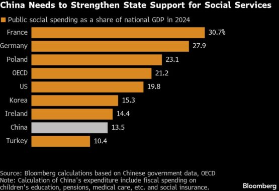 China’s social security safety net is meagre, especially for those living in the countryside, which encourages so-called precautionary savings. The government’s social spending — including pensions, medical care, unemployment and low-income housing — was equivalent to 13.5% of GDP in 2024, Bloomberg calculations based on official data show, versus an average in OECD countries of 21.2%.