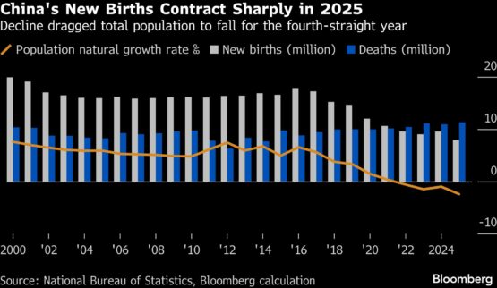 Household deposits exceeded 165 trillion yuan ($24 trillion) as of the end of 2025, with most being in low-return time deposits. More than 31% of disposable income is saved rather than spent, according to Bloomberg calculations based on government figures — much higher than the ratio in other major economies.
