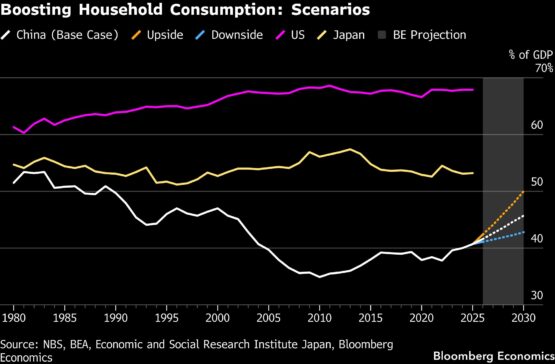 Currently stuck at an estimated 41% of GDP, Bloomberg Economics forecasts consumption will grow to make up 46% of the economy by 2030.