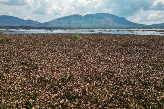 During peak summer months, in which hyacinth thrives, more than half the dam can be covered. This January, although 52% of the dam was covered by hyacinth, satellite imagery shows that many of the plants were beginning to turn from green to brown, suggesting that they were not in good health and that the plant hoppers are having an effect. Some parts of the hyacinth “carpet” have lost buoyancy and started to sink.