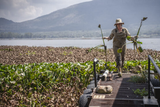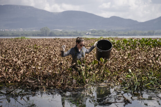 Dr Kelby English wades through dying water hyacinth at the Hartbeespoort Dam, collecting samples for research.