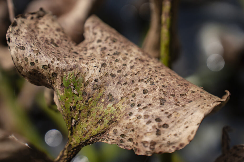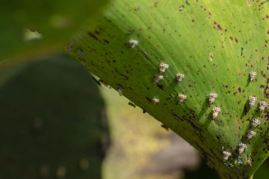 In addition to the discolouration, fewer hyacinth plants are producing flowers. This indicates that the plant hoppers are successfully preventing the plants from producing seeds that spread.