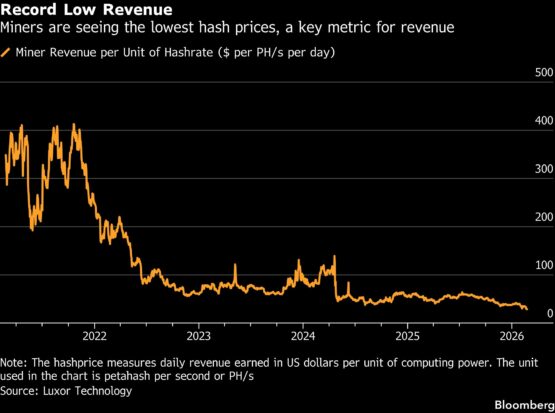“This transition may prove to be the end of an era for some large US miners, not necessarily in terms of survival, but in how they operate, as they adapt away from models built for a different capital and energy market environment,” said Matthew Kimmell, an investment strategist at CoinShares, which has an exchange-traded fund that tracks public crypto miners. “Margins are just getting really thin, hash price kicking bottoms. It’s brutal out there.”