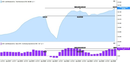 Levi’s revenue and EPS (12-month rolling to adjust for seasonality inherent in clothing)