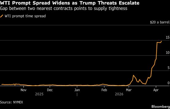As the war grinds on, there are signs of deepening concern about near-term supply. WTI’s prompt spread — the difference between its two nearest contracts — at one point traded near $15.50 a barrel on Monday, near the biggest premium on record. The widening was ushered in by firming expectations of tighter US supplies as overseas buyers rush to purchase American crude.