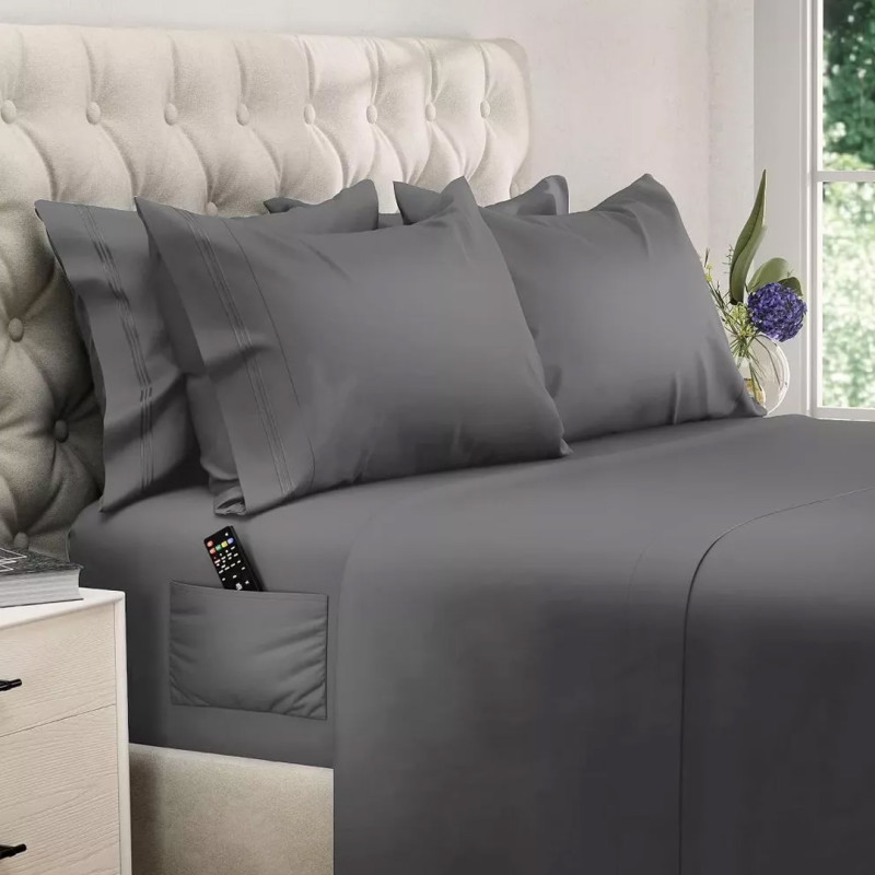 This microfiber sheet set features a deep-pocket design with upgraded elastic bands that not only easily fit over your mattress without struggling, but also stay in place, and provide a non-slip corner strap on each corner to help secure the fitted sheet. This set fits mattresses with a depth of up to 21 inches. The set also includes a top sheet and two envelope-style pillow cases with double-stitched embroidered edges for an elegant touch that also provides durability. The envelope design folds over the ends of the pillows and allows them to stay secure throughout the night. It also features two pockets sewn into the side of the sheet, offering a place to set your phone, TV remote, journal, or other items to have them close by every night.