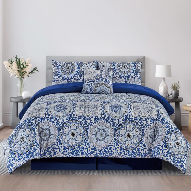 - Includes: A comforter, two pillow shams, a bed skirt, and a decorative pillow.