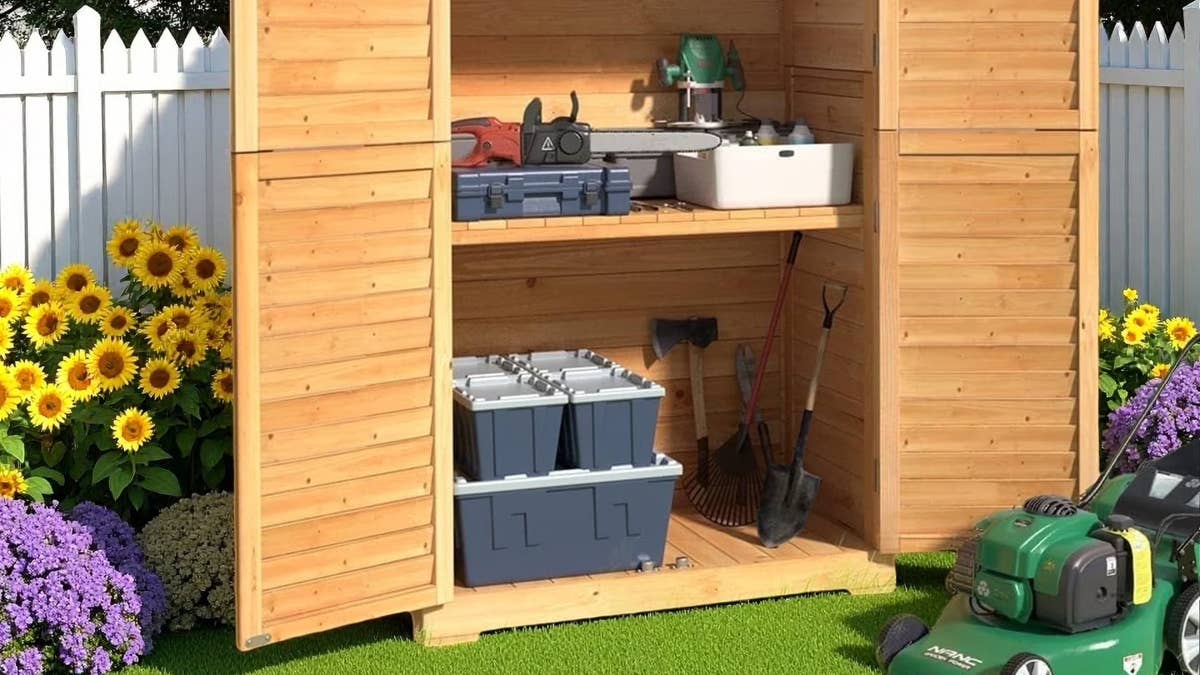 Overall, the Lofka Wooden Outdoor Storage Cabinet is a great pick for smaller storage areas. The adjustability allows you to customize your storage needs for large items like shovels and rakes, or smaller items like tool boxes. The wood looks great in any outdoor setting, and the locking doors offer security. Shoppers can save $150 on this unit, spending just $140.