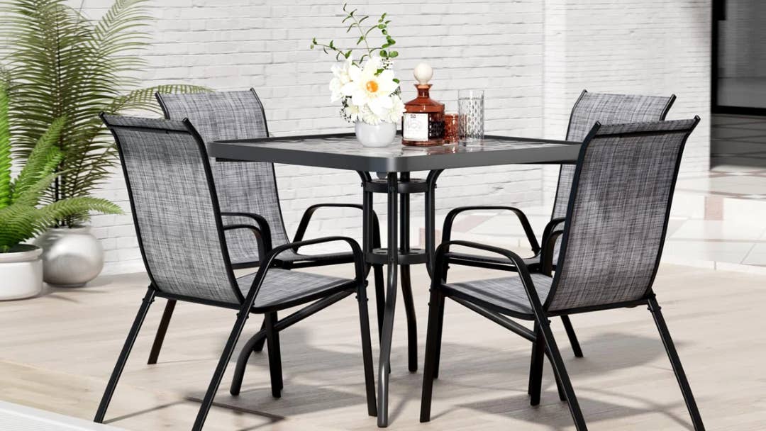 The five-piece dining set is certainly a more simple option in appearance, but it’s perfect for the person who wants something sleek, sturdy, and effective. Constructed from a powder-coated steel frame, the chairs and table are designed for outdoor all-weather conditions. The steel is what gives the chairs and table a solid, sturdy build.  Meanwhile the powder coating, which is usually polyester or epoxy that’s baked onto the steel, creates a hard, protective barrier that makes the metal highly resistant to rusting, scratching, chipping, and fading from exposure to the elements or the sun. The chairs, four in total, each have a PVC-coated polyester fabric along the seating area that’s waterproof and UV-resistant, offering great strength and longevity. Research shows that it can last between five to 10 years all while resisting abrasion, mold, and freezing. The table is topped with a 5-millimeter thick hydrographic glass, created using a specific water transfer printing process for an intricate design that’s resistant to wear and tear, even with lots of sun exposure.