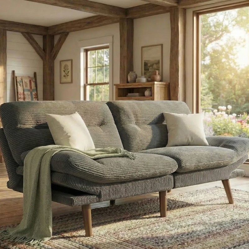 Made with fiber-wrapped foam, solid and manufactured wood, and upholstered in corduroy fabric, this convertible sofa bed offers versatility and comfort. Built with a robust wooden frame and six solid wood legs, the sleeper sofa offers great stability, whether it’s positioned as a sofa or fully reclined, and can support up to 600 pounds of weight at once. Thick, 7.1-inch cushions made with foam provide support and padding for a comfortable sitting and sleeping experience, and the textured, corduroy upholstery makes the furniture even softer while also adding a stylish look to the piece.