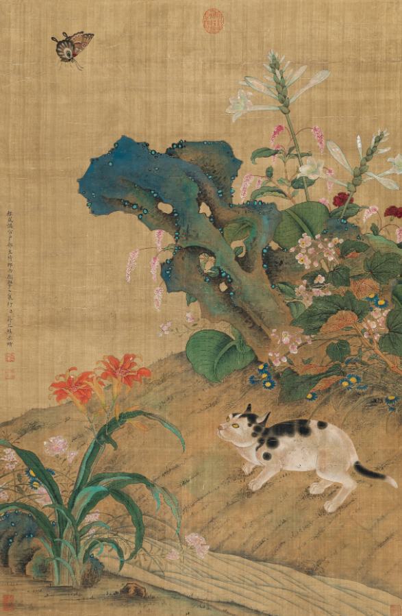 明清时期文人画发展达到鼎盛,此类猫蝶图的寓意是作者个人心境的写照。中国国家博物馆藏清代恽寿平绢本设色《秋卉狸猫图》,绘一只黑白相间的猫,双目圆睁,屏息凝神,以猛虎下山之势伏于坡石上;花卉山石以没骨叠色法写就,雅致多姿。左上自题七绝一首:“偃草雄风势壮哉,怒猊腾掷下苍苔。于今社鼠应难捕,闲觑花阴蛱蝶来。”
